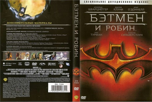 ![]() Бэтмен / Batman (1989) 2xDVD9 Бэтмен возвращается / Batman Returns (1992) 2xDVD9 ![]() Информация о фильме Название: Бэтмен возвращается Оригинальное название: Batman Returns Год выхода: 1992 Жанр: боевик Режиссер: Тим Бёртон В ролях: Майкл Китон, Дэнни ДеВито, Мишель Пфайффер, Кристофер Уокен, Майкл Гоф, Майкл Мерфи, Кристи Конэуэй, Эндрю Бринярски, Пэт Хингл, Винсент Скьявелли О фильме: Над Готэмом нависла новая угроза. Два эксцентричных персонажа: мерзкий Пингвин, брошенный родителями и вышедший из городской канализации, и таинственная Женщина-Кошка начали борьбу за власть. Один из них намерен занять кресло мэра города, а другая испытывает романтические чувства к готэмскому герою. Сможет ли Бэтмен победить таких грозных противников одновременно?   ![]() ![]() детям до 13 лет просмотр не желателен Страна: США, Великобритания Студия: PolyGram Filmed Entertainment, Warner Bros. Pictures Продолжительность: 121 мин. / 02:01 Перевод: полное дублирование Бонус-Диск: Летучая мышь, кошка и пингвин; Тени летучей мыши; По ту сторону Бэтмена; Галерея образов героев и злодеев; Музыкальный видеоклип Файл Кодек: MPEG2 Качество: 2xDVD9 Видео: PAL 16:9 (720x576@1024x576) VBR 6625 Kbps, 25.000 fps Аудио 1: Dolby AC3, 6 ch, 48.0 KHz, 384 Kbps [русский] Аудио 2: Dolby AC3, 6 ch, 48.0 KHz, 384 Kbps [английский] Аудио 3: Dolby AC3, 6 ch, 48.0 KHz, 384 Kbps [польский] Аудио 4: Dolby AC3, 2 ch, 48.0 KHz, 192 Kbps [комментарии] Субтитры: русские, английские, польские Размер: 11.2 GB Бэтмен навсегда / Batman Forever (1995) 2xDVD9 ![]() Информация о фильме Название: Бэтмен навсегда Оригинальное название: Batman Forever Год выхода: 1995 Жанр: фантастика, боевик, приключения Режиссер: Джоэл Шумахер В ролях: Вэл Килмер, Томми Ли Джонс, Джим Керри, Николь Кидман, Крис О’Доннелл, Майкл Гоф, Пэт Хингл, Дрю Бэрримор, Деби Мейзар, Элизабет Сэндерс О фильме: Бэтмен продолжает войну со злом. На этот раз ему предстоит биться с двумя объединенными злодеями: бывшим окружным прокурором пострадавшим от кислоты Двуликим и сумасшедшим гением Загадочником. А помогать ему станет юный акробат по имени Робин.   ![]() ![]() детям до 13 лет просмотр не желателен Страна: США, Великобритания Студия: PolyGram Filmed Entertainment, Warner Bros. Pictures Продолжительность: 116 мин. / 01:56 Перевод: полное дублирование Бонус-Диск: Почему Бэтмен навсегда?; Тени летучей мыши; По ту сторону Бэтмена; Галерея образов героев и злодеев; Удаленные сцены; Музыкальный видеоклип Файл Кодек: MPEG2 Качество: 2xDVD9 Видео: PAL 16:9 (720x576@1024x576) VBR 5995 Kbps, 25.000 fps Аудио 1: Dolby AC3, 6 ch, 48.0 KHz, 384 Kbps [русский] Аудио 2: Dolby AC3, 6 ch, 48.0 KHz, 384 Kbps [английский] Аудио 3: Dolby AC3, 6 ch, 48.0 KHz, 384 Kbps [польский] Аудио 4: Dolby AC3, 2 ch, 48.0 KHz, 192 Kbps [комментарии] Субтитры: русские, английские, польские Размер: 10.6 GB Бэтмен и Робин / Batman & Robin (1997) DVD9+DVD5 ![]() Информация о фильме Название: Бэтмен и Робин Оригинальное название: Batman & Robin Год выхода: 1997 Жанр: фантастика, боевик, криминал Режиссер: Джоэл Шумахер В ролях: Арнольд Шварценеггер, Джордж Клуни, Крис О’Доннелл, Ума Турман, Алисия Сильверстоун, Майкл Гоф, Пэт Хингл, Джон Гловер, Эль Макферсон, Вивика А. Фокс О фильме: Над Готэмом вновь нависла угроза: злодей-морозилка Мистер Фриз и психованная любительница растений по кличке Ядовитый Плющ решают уничтожить город. Единственные, кто могут остановить злодеев — Бэтмен и Робин, однако у этих супергероев возникают разногласия…   ![]() ![]() детям до 13 лет просмотр не желателен Страна: США, Великобритания Студия: PolyGram Filmed Entertainment, Warner Bros. Pictures Продолжительность: 116 мин. / 01:56 Перевод: полное дублирование Бонус-Диск: П